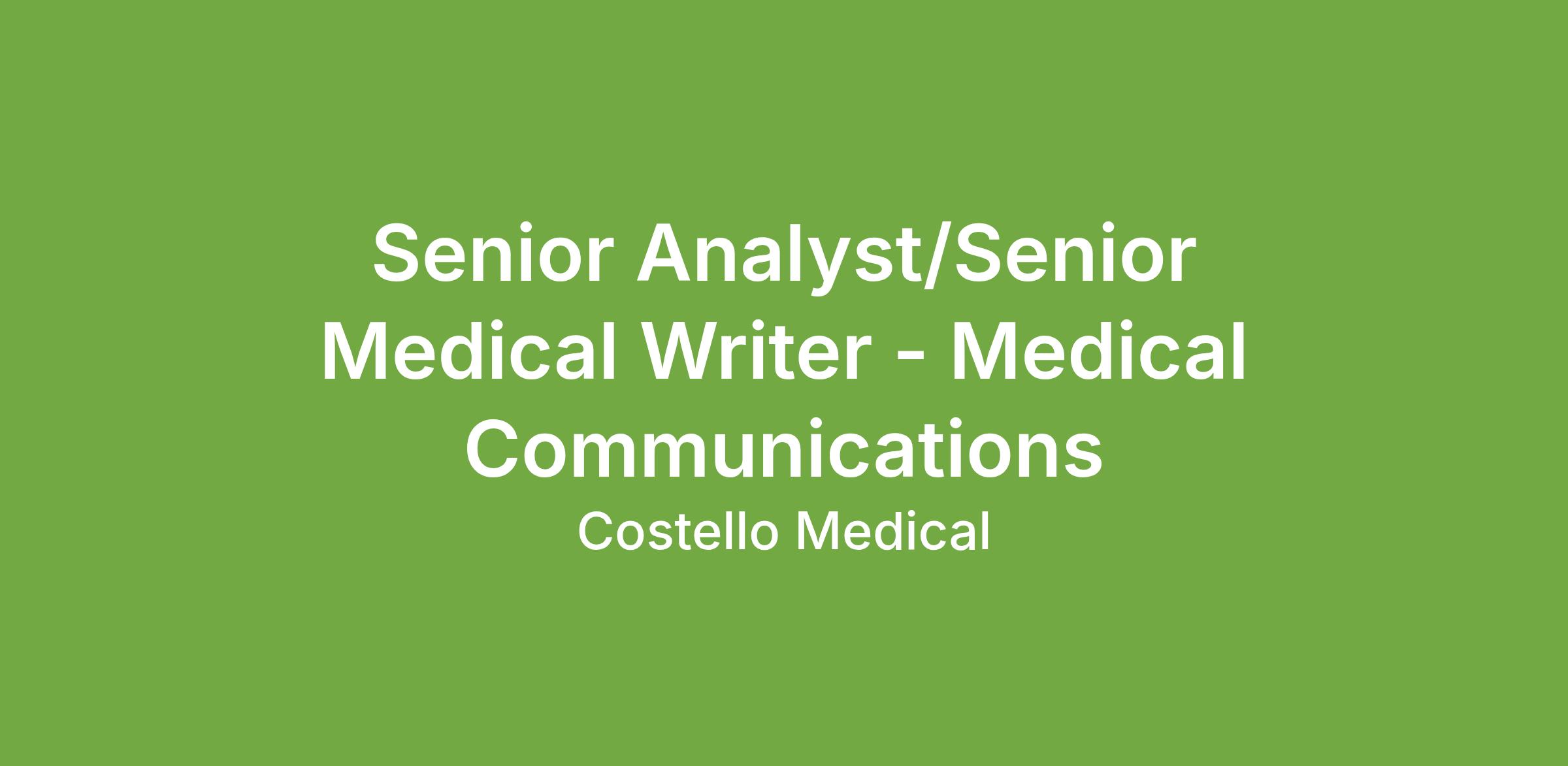 Do you have experience successfully delivering publications or medical affairs projects? Do you enjoy building and maintaining client relationships? Costello Medical are growing their team due to demand from both new and existing clients and are therefore looking for candidates with prior experience in medical communications who enjoy content delivery and project management to join us as Senior Analysts and Senior Medical Writers.